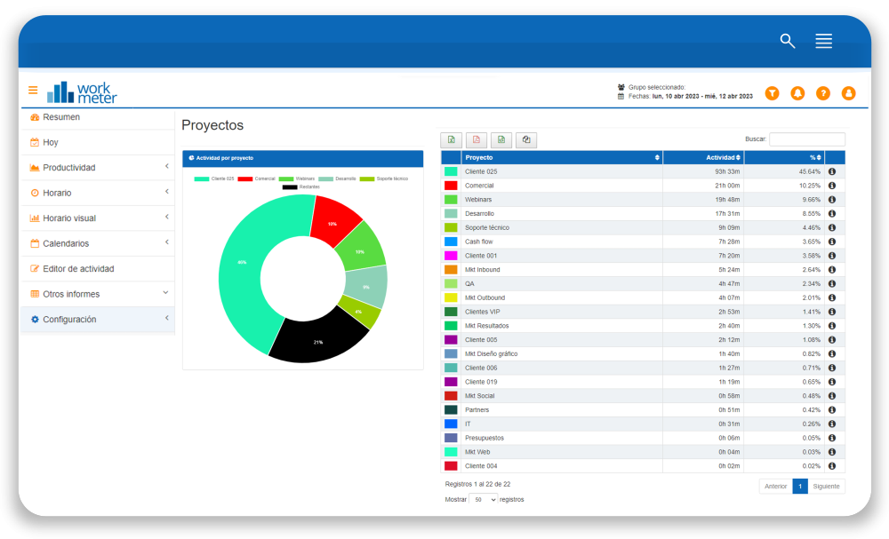 Porque te permite transformar la gestión del tiempo en una ventaja estratégica. Su tecnología recopila de forma automática datos clave sobre la actividad laboral y la productividad, ofreciendo una visión completa y precisa del uso del tiempo en la organización. Desde el control de presencia hasta el análisis del tiempo invertido en proyectos, WorkMeter proporciona información accionable que ayuda a optimizar procesos, mejorar la eficiencia operativa y tomar decisiones fundamentadas en datos reales y objetivos.